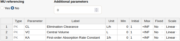The main element of the PARAMETERS interface is the table of parameters where you can define the parameter name, label, unit, minimum value, initial value, maximum value, scale, and whether the parameter is fixed or not (for NONMEM models only). If the model selected in the STRUCTURE menu was part of the code library of PK and/or PD models, the table will be pre-populated with the expected parameters of the model. Alternatively, you can add parameters to the table using the Additional parameters fields shown above the table.